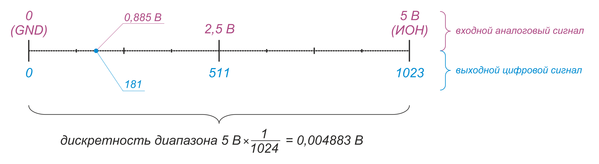 Микроконтроллер Atmega 328P, на котором построен Arduino Uno содержит встроенный 10-битный аналого-цифровой преобразователь (далее АЦП, англ. ADC — Analog to Digital Converter) последовательного приближения. Именно он, как видно из названия, отвечает за оцифровку входящего аналогового сигнала.